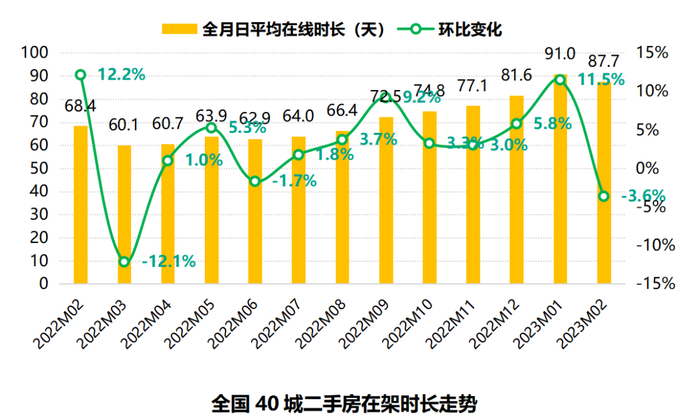 2023年2月,全国40城二手房在架时长为87.7天,环比下跌3.6%。二手房在架时长在连续上涨7个月之后首次出现回落,主要原因是成交回暖,部分已成交房源的下架,还有就是业主新上架房源量增加,从而导致在架时长的降低。