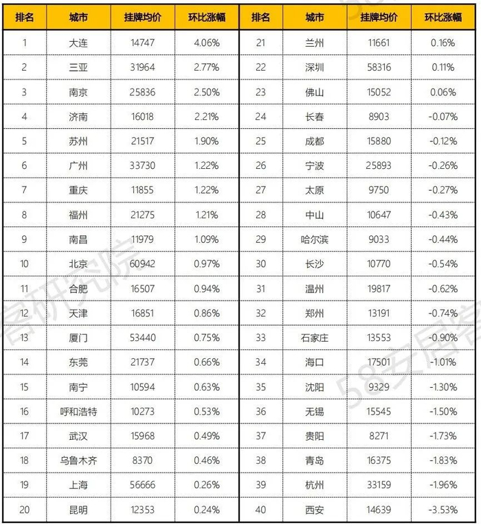 三、全国40城二手房挂牌价同比涨幅城市排行榜