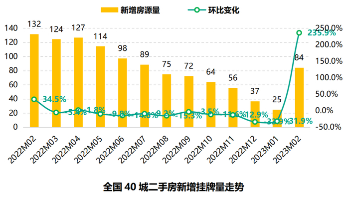 2023年2月,全国40城二手房新增挂牌量为84万套,环比增加235.9%。市场快速回暖,经纪人在节后的回归,直接带动新增挂牌量出现大幅提升,并且是所有城市都出现了大幅的提升,表明此次市场的回暖是全面的。