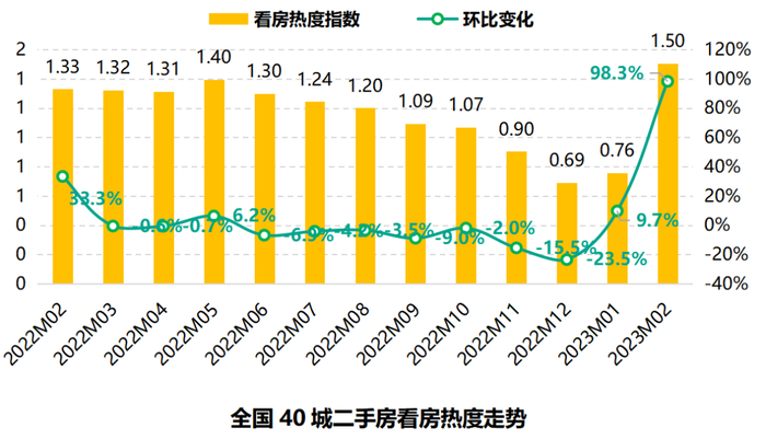 2023年2月,全国40城二手房看房需求热度指数为1.50,环比上月基本翻倍。购房者需求热度在2月份出现大涨,已超过2022年最高点,表明目前的购房者看房意愿强烈,短期内成交量将会出现明显提升的可能性。