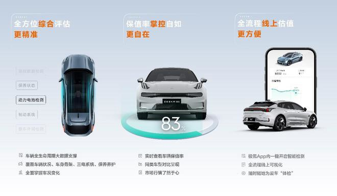 据悉,极氪自研检测工具,推出 360 余项智能电动汽车专业检测标准,并依托大数据精准算法模型,自动生成可公开的三电综合状态评分、历史车况等级、整车综合车况评分。结合检测评级和市场行情,极氪车辆价值管理系统进行综合分析,给出合理的定价。