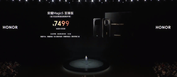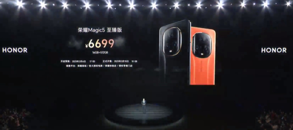 在此次发布会上,荣耀带来了荣耀Magic5、荣耀Magic5 Pro和荣耀Magic5 至臻版三款机型。其中荣耀Magic5和荣耀Magic5 Pro均提供3种不同规格的版本,其中标准版起售价3999元,Pro版起售价5199元。而定位最高的荣耀Magic5 至臻版则一步到位,提供16GB+512GB一种内存规格版本,售价6699元,而含万宝龙特别定制保护壳套装版售价7499元。新机将于3月10日上午10:08分正式开售。