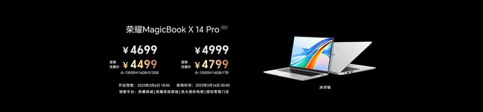 荣耀MagicBook X 16 Pro,i5-13500H/16GB/512GB 4599元,首销优惠价4299元;i5-13500H/16GB/1TB 4899元,首销优惠价4499元;全系于3月6日18:00在荣耀商城、各大授权电商、授权零售门店开启全渠道预售,3月16日00:00正式开售。