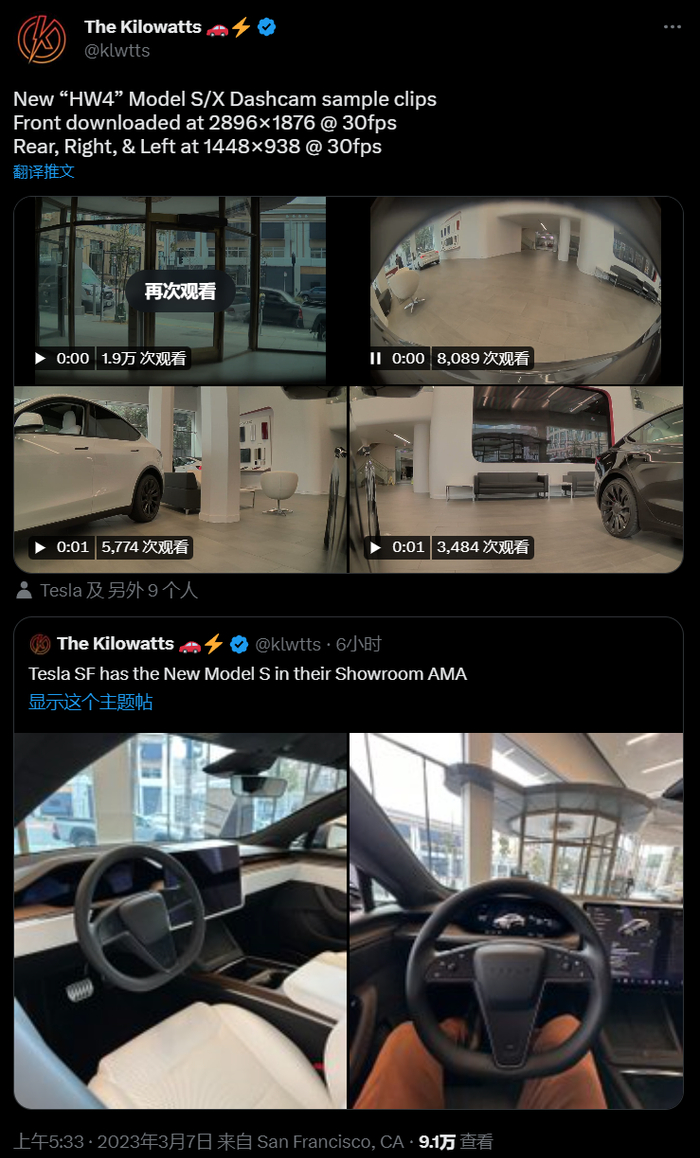 此外,Twitter 用户 @Kilowatts 冒险潜入了特斯拉的一个停车场,并拍下了首批配备 HW 4.0 硬件车型的照片。