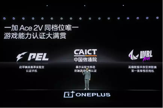 一加 Ace 2V 成为和平精英赛事实验室认证手机、英雄联盟手游亚洲联赛第一赛季推荐用机,并获得泰尔实验室移动端手游性能认证。