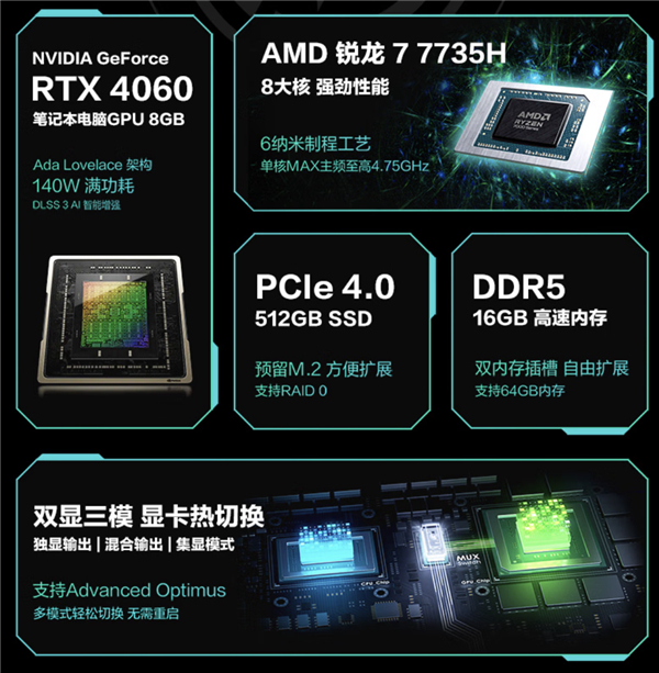 锐龙7 7735H基于6nm工艺,8核心16线程,最高加速频率4.75GHz,RTX 4060当然也能140W满血释放,支持双显三模热切换。