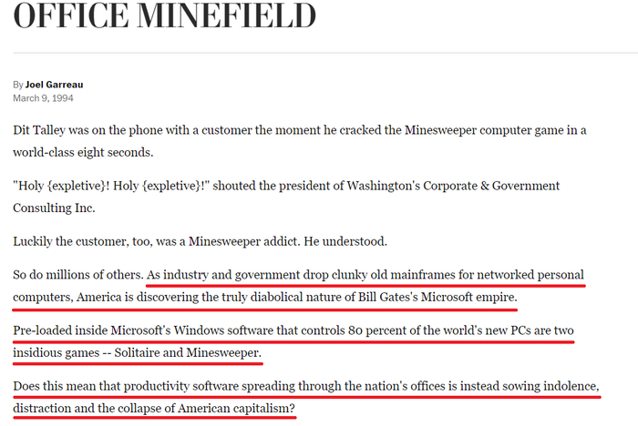 “随着企业和政府在选择联网的个人电脑时放弃了笨重老旧的大型机器,美国正在发现比尔·盖茨的微软帝国真正的恶魔本质。控制全球80%新电脑的微软Windows软件预装了两款阴险的游戏——《纸牌》和《扫雷》。这是否意味着,在全国的办公室传播的生产力软件,反而在播下懒惰、分心和美国资本主义崩溃的种子?”