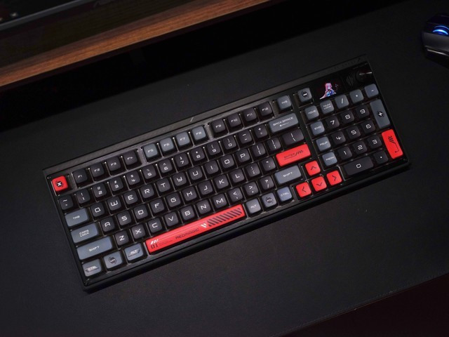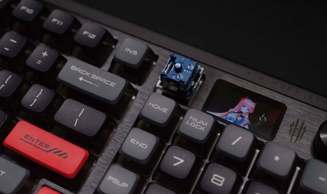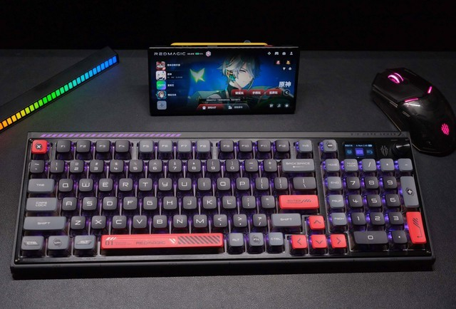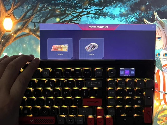 个性化体验方面,红魔键盘内置一块1.47寸的显示屏,可实时显示参数及红魔姬壁纸,用户可自定义喜好图片,搭配旋钮可完成系统音量等参数调节快捷操作。