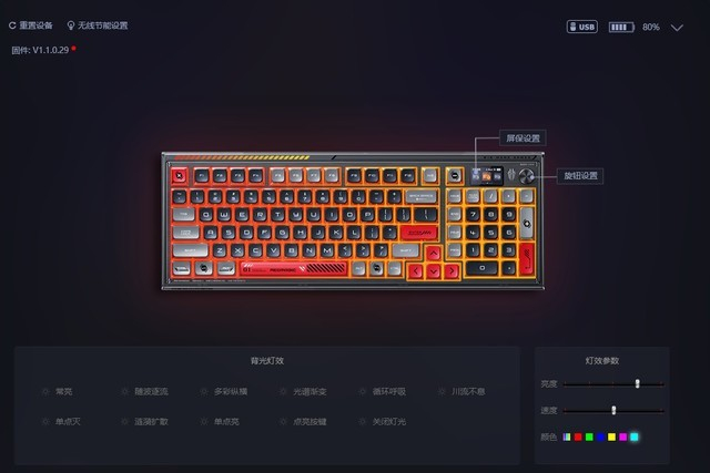 其他方面,红魔键盘拥有4000mAh电池和省电模式,支持最高续航350小时。灯效方面拥有1680万色,12种灯效模式,并且就可以通过魔云智控系统设置。