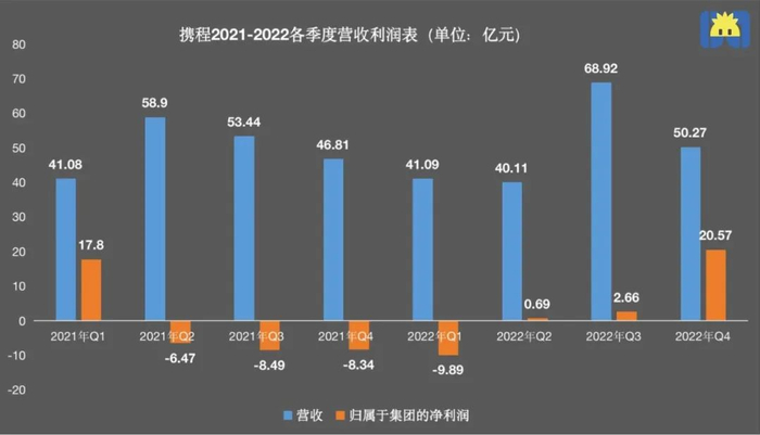 从去年12月以来,人们报复性出游的需求有多强烈,携程的业绩就有多亮眼。3月7日,携程发布了美股2022年Q4及全年财报,传递了一丝暖意。携程在Q4实现营收50亿元,同比增长7%;实现净利润21亿元,同比增长346.64%,为过去三年的单季度最高。携程2022年的全年收入与2021年持平,同时迎来近三年的首次盈利,净利润达14亿元。去年第四季度的旅游业还谈不上复苏,因此携程这份财报也被业内视为黎明前的曙光——还没有恢复到疫情前的水平,但至少已经开始呈现好兆头。要知道受疫情影响的2020年和2021年,旅游行业默默流传着一张“死亡”名单,上面共有近35家中小旅游相关企业。经过漫长的三年疫情,以携程为代表的OTA平台也终于迎来春天。谁都无法否认携程通过出境游、本土短途游和下沉市场寻找增长点的努力,但疫情前就出现的核心业务增速放缓问题、竞争对手围攻问题以及与上游合作方的矛盾问题,还需要进一步解决。 同样遗憾的是,携程扭亏的业绩并没有让资本市场买账,财报发布后,携程美股股价微跌2.80%,报37.53美元/股,较过去一年最高60.65美元/股的价格跌去38.1%。 站在2022年的春天里回望过去三年的冬天,希望OTA平台们能早日真正跨过寒冬。 三年来首次盈利,但携程开始变“慢”了旅游业复苏的迹象,在携程2022年的年报中展现得淋漓尽致。 根据财报显示,2022年全年,归属于携程集团股东的净利润为14亿元人民币,同比增长355.09%。虽然较2019年跌去了80%,但这是疫情三年来携程首次扭亏为盈。净利润的增速甚至高于在线旅游巨头Booking同期的162.49%。