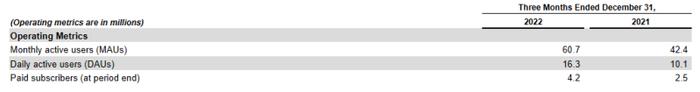 收入增加主要归功于用户的强劲增长。2022年Q4,多邻国的月活跃用达到6070万,上年同期仅有4240万,同比增长43%,日活跃用户同比增长62%至1630万。截至2022年底,多邻国付费订阅者达420万,比上年同期的250万增长67%。