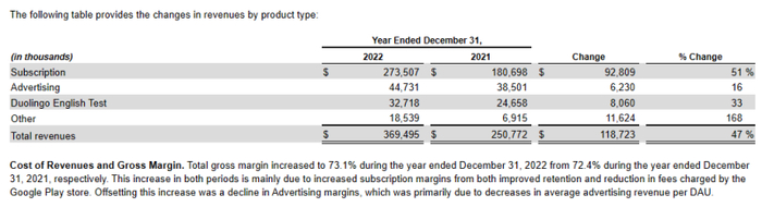 财报显示,2022年全年,多邻国的收入同比增长47%至3.69亿美元,毛利同比攀升49%至2.7亿美元,毛利率从上年同期的72.4%上升至73.1%。