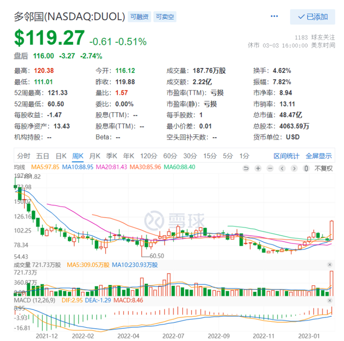 目前,资本市场依然处于比较沉寂的周期,在此背景下多邻国连续亏损,释放出的信号并不积极。虽然Q4及全年财报发布次日,多邻国股价出现22.24%的涨幅。但截至2023年3月3日,多邻国股价仍只有119.27美元/股,与其最高点205美元/股相比已经跌去42%。