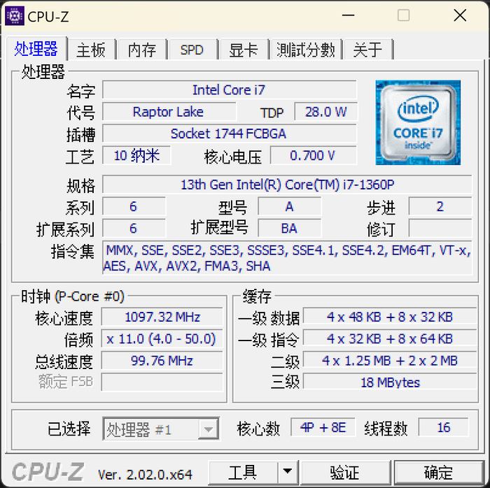 在这个散热模组下覆盖的,是 intel 全新的 i7-1360P 处理器,它拥有 4 个性能核,8 个能效核,共计 12 核 16 线程,最高频率可达 5.0GHz,预设基准功耗为 28W。本次 13代酷睿移动端处理器最大的升级之处在于低负载功耗,这意味着续航会有不小改观,具体的续航表现我们稍后测试下。