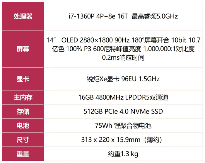 IT之家拿到了 i7-1360P + 冰川银配色的灵耀14 2023,并为大家带来详细的图文评测,下面是它的配置简表。