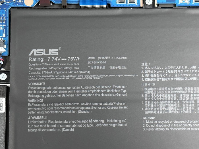 最下方是一块 75Wh 的电池,由于 13代酷睿的续航大大改善,再加上 OLED 屏比较省电,相信在后续的续航测试中有惊喜。