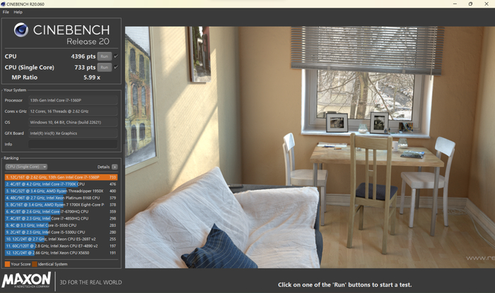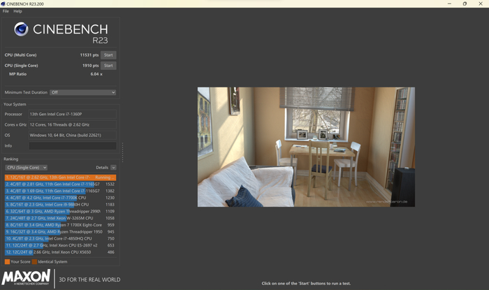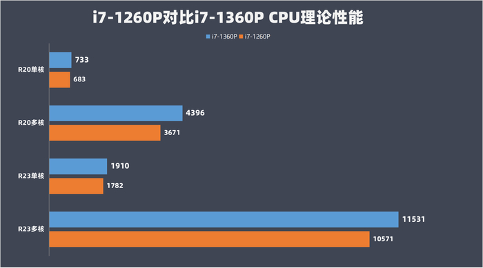 上一代灵耀14 2022 采用的是 i7-1260P,这一代升级成了 i7-1360P,那么两者的差距有多大呢?首先是代表 CPU 理论性能 CineBench R20。i7-1360P 单核得分 733 分,多核得分 4396 分;R23 单核 1910 分;多核 11531 分。