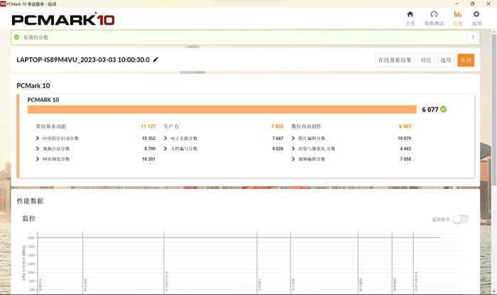 接下来,我们用 PCMark10 和 CrossMark 两款软件来测试灵耀14 2023 的综合办公性能。结果如下,灵耀14 2023 分别得到了 6077 分和 1851 分,相比于上代提升了大约 20%,足以应对日常办公和部分创意制作的任务。