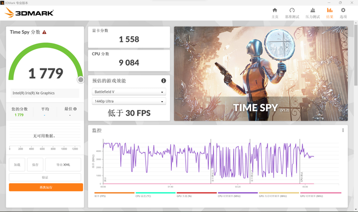 GPU 依旧是 96EU 满血 Xe 核显,这几年英特尔的核显一直没啥进步,一直是可以应付轻度网游,同时在视频编解码这块比较吃香。实测这个核显在 3DMark TimeSpy 中最终得分 1558 分,约等于 MX350 独显。
