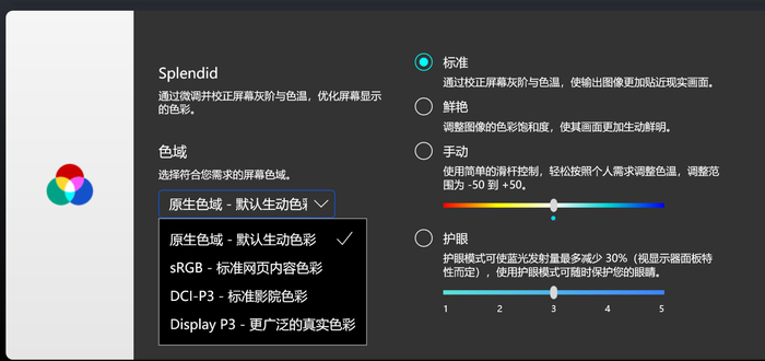 灵耀14 2023 在系统内也集成了四种专业色域的切换功能,可以在原生、sRGB、DCI-P3 和 DisPlay P3 间切换。