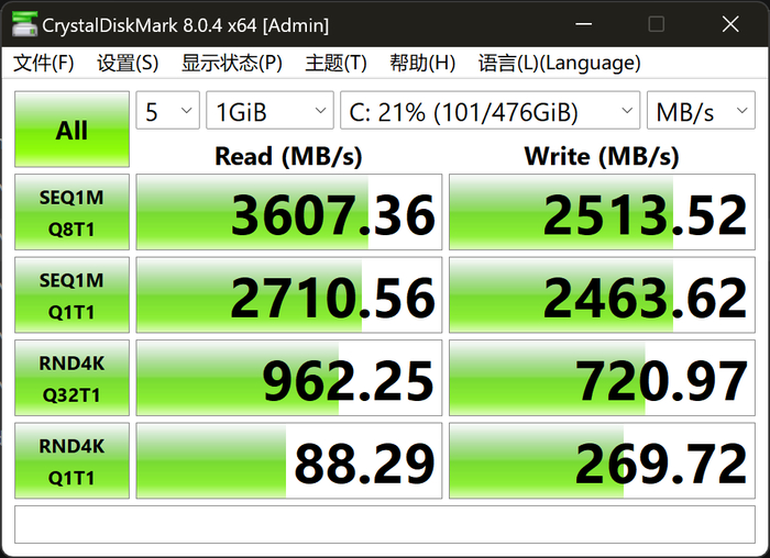 整机只有一个硬盘插槽,升级会比较麻烦,但是可以拆卸进行更换。搭载的硬盘是镁光的 PCIe4.0 硬盘,TLC 颗粒。有需要的话可以自行升级更大的 2T 固态。