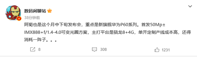 华为P60系列或于本月中下旬问世 首发IMX888传感器
