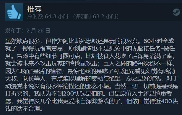 凭借着对原作全方位的忠实还原,这游戏超脱了一般游戏“好玩或是不好玩”的寻常标准,以至于玩家们为其造了个和“游戏性”相对应的新词汇——“深渊性”。