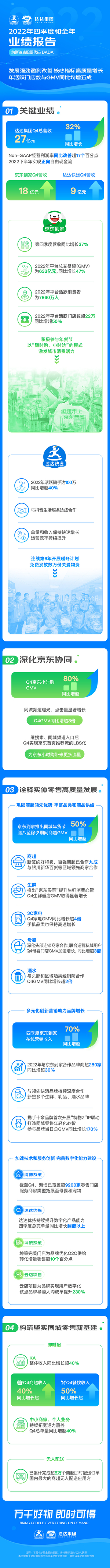 “四季度,在宏观压力下,我们继续保持良好的执行力。我们的团队专注于平台商品供给的丰富和用户体验的提升,与此同时,我们高度灵活的骑手网络在疫情期间继续为消费者和商户合作伙伴提供配送保障。”达达集团总裁何辉剑表示,“我们对未来充满期待。随着即时零售在每一个本地零售品类中稳步渗透,我们相信我们赋能零售商的丰富经验和与京东集团深入合作所释放的协同效应,将使我们在未来几年很好地抓住行业机会。”