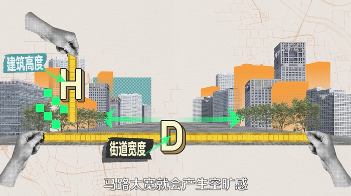 从专业的街道美学角度也能解释这种感觉:街道宽度(D)与两边建筑物(H)应该有一个合适的比例,马路太宽,就会产生空旷感;建筑太高,容易产生压迫感;比较适合的比例是1:1、1:2左右。
