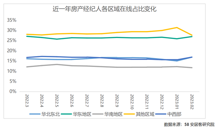 受2022年底房地产市场不景气影响,春节期间,不少发达地区房产中介提前关门放假或歇业,其他区域的影响则没有这么大,因此随着节后返工,其他区域的在线房产经纪公司占比显著减少。