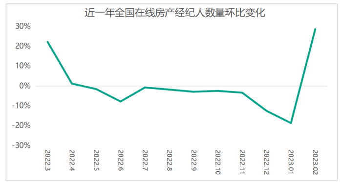 2023年2月,在线作业的房产经纪人环比大增,一方面是节后返工人流重新投入工作,另一方面,随着1月份核心一二线城市房地产市场先行指标,房价的上涨,市场逐渐显露回暖的迹象,不少中介开启新一轮的招聘,这也造成了经纪人数量的增加。