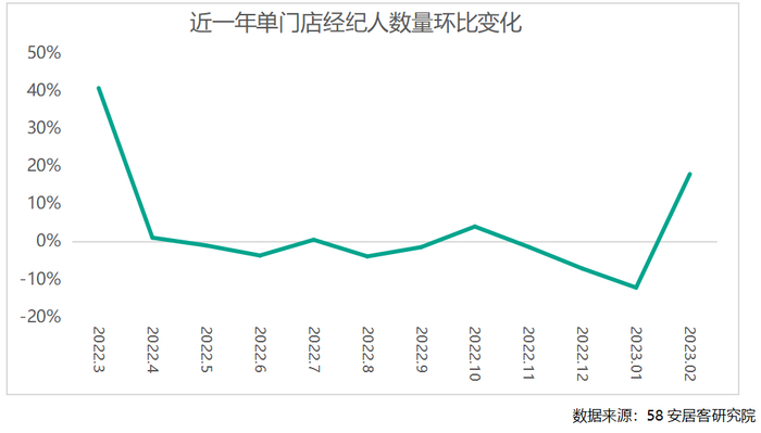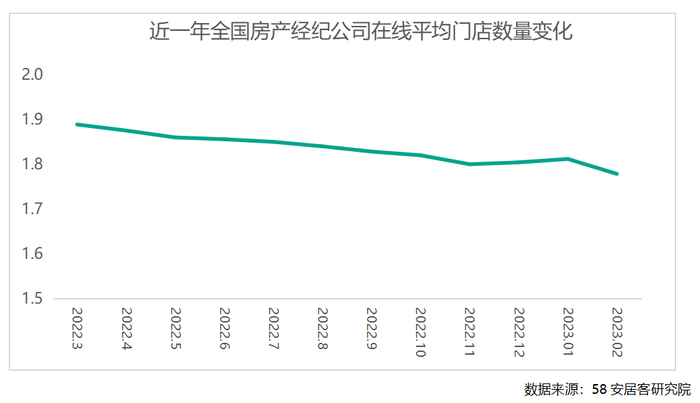 2023年2月,单体经纪公司包含的平均经纪门店数量继续下探,经纪公司在线门店规模进一步减少,显示行业仍在收缩,尚未回暖。