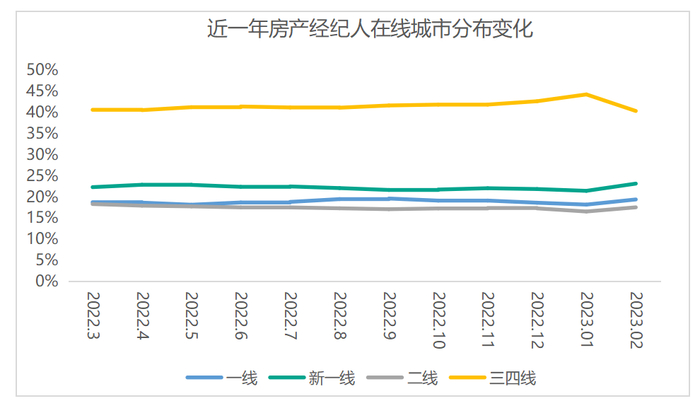 2月份,一线、新一线和二线城市经纪门店占比均提升约0.5%,相反三四线城市在线房产经纪门店占比减少约1.5%。随着假期的结束,叠加楼市利好政策,核心一二线城市房地产市场率先露出复苏迹象,随之也激发出城市经纪门店的活力。