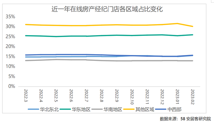 从在线经纪门店的区域分布来看,2月份华北东北、华东区域和中西部区域经纪门店占比均有较为明显的上升,三大区域提升占比均为0.5%左右。华南区域经纪门店占比保持稳定,其他区域的门店占比明显下降。