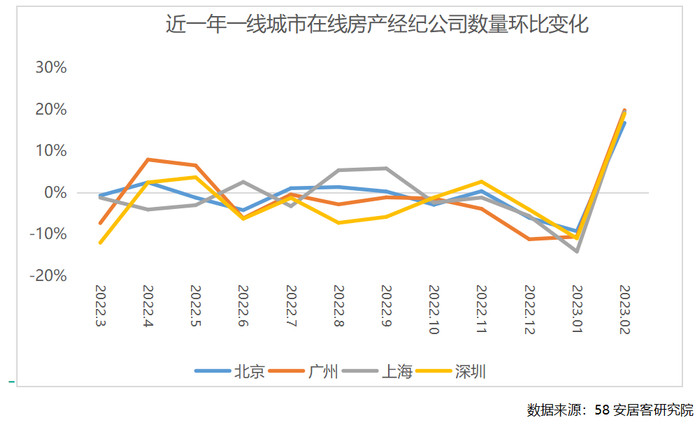 2023年2月,四个一线城市在线经纪公司数量均大幅增长,涨幅在15%到20%之间,这一方面是受到节后返工影响,另一方面也受楼市回暖的影响。一线城市基本面良好,需求仍然存在,楼市逐渐复苏,行业也有望迎来“阳春”。
