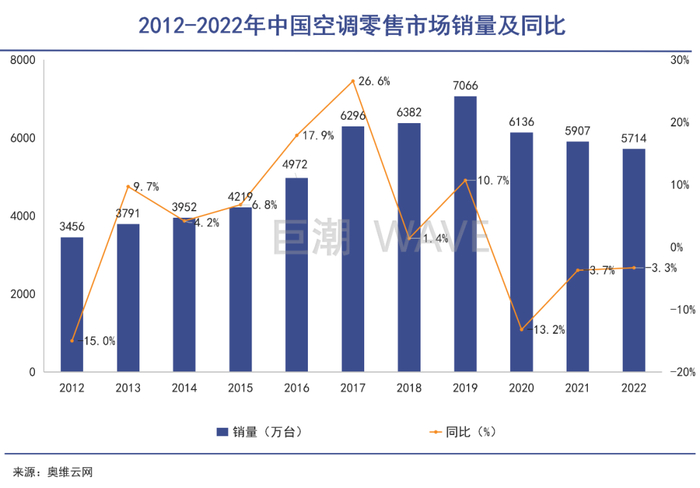 她是铁面无私、雷厉风行的“中国商界铁娘子”,也是多年来独自抚养孩子的单身妈妈;她是世界500强企业掌门人,也是一位备受关注和争议的网红企业家。她如守夜人一般坚持制造业,与雷军打赌,和竞争对手死磕;她坚定拥抱直播带货,甚至还钦定了年轻的“网红接班人”;由于距离互联网太近,她甚至被传出绯闻,并怒斥谣言自证清白;她既是亲力亲为的一把手,也是格力铁打的一号代言人。董明珠对于格力这家公司在传播上的赋能,甚至让人忘记了它其实脱胎于国企。他带领格力一路扩张,坐上世界第一空调企业的宝座。但在家电行业增速放缓的大背景下,格力也在面临“中年危机”,核心空调产品的收入也被老对手美的反超。在寻找企业发展的第二曲线时,她的偏执差点害了格力——投资珠海银隆一波三折甚至反目为敌——后者更是丑事连连,更别说关于格力手机的各种“旧闻”……由男人主导的商业世界中,董明珠显得那么扎眼,却又如此耀眼。她的铁腕管理创造了格力昔日之辉煌,但“董小姐”的特立独行,如钢筋铁骨般的执拗,也让格力这家沉稳的制造业公司,增添了不少戏剧色彩。但如今的董明珠已经与格力电器一起,站到了自己可能的边界之上。二者是否能够突破这个近乎刚性的边界,将以怎样的方式突破这个边界,对于所有关心格力和董明珠的投资者、分析师乃至吃瓜群众们来说,都是相当重要的。难缠的老对手作为一种调节室内温度的家电,空调行业与地产大周期紧密相关。两个行业的增长曲线也是高度吻合。2020年起,地产严调控叠加疫情爆发,空调行业遭遇三连降。奥维云网数据显示,2022年我国空调零售销量5714万台,仅有2019年最高峰时的81%。