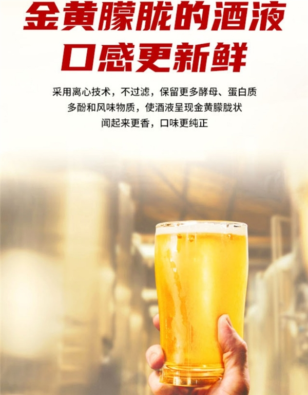 采用离心技术,不过滤,保留更多酵母、蛋白质、多酚和风味物质,使酒液呈现金黄朦胧状,闻起来更香,口味更纯正。