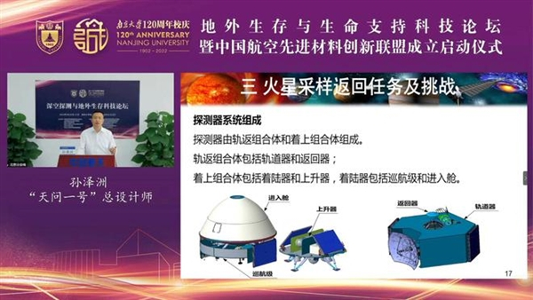 根据孙泽州之前的演讲资料,执行火星采样返回任务计划的结构与嫦娥5号飞船相似,探测器主要由两个组成部分,分别是轨返组合体和着上组合体: