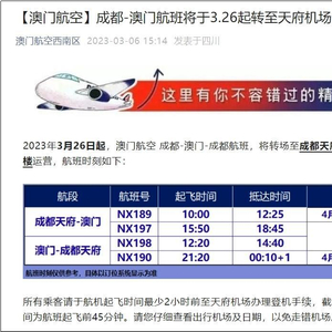 3月6日,澳门航空公布了成都航班转场通知,自3月26日起,澳门航空的成都航班将全面转至成都天府国际机场T1航站楼运营。这是成都首家公布转场天府机场的港澳航空公司。