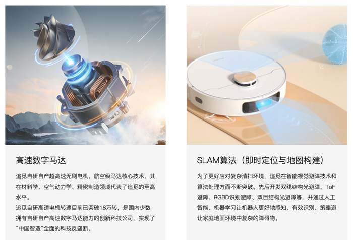 第二块是人工智能算法,我们称之为广义机器人的“大脑”,追觅突破 Slam、ToF 固态雷达、结构光等算法,在 AI 领域持续精进,增强场景识别和语义理解能力,让追觅的产品具备高级人工智能,全面且个性化地解决全场景下复杂的用户痛点。