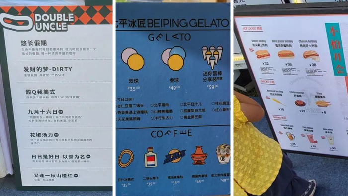 因此,可以在这里看到许多“外面很难找到的东西”,当然,它们也来自“外面不常见的品牌”。比如,名为“大丰收”的咖啡,里面包含了咖啡、酒精、柠檬汁、胡萝卜汁、以及大量的糖浆;比如,一款加了臭鳜鱼的汉堡;再比如,豆汁火锅味的冰淇淋。