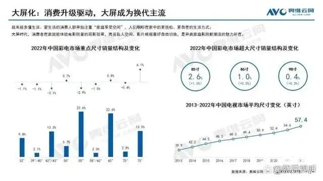 第三,在视听消费文化上,手机、平板、IT产品占据了中小屏幕、片段时间、差异化娱乐市场,电视机的价值中枢进一步向大屏震撼性体验效果聚焦。彩电正在一定比例上,从全能终端,变成“大屏特效体验”终端。消费者对大尺寸的依赖显著加强。