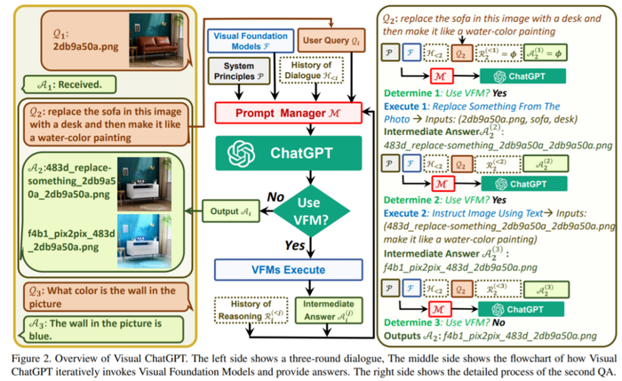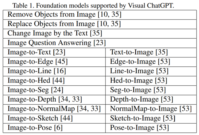 - VFM 的可访问性:Visual ChatGPT 可以访问 VFM 列表来解决各种 VL( vision-language ) 任务。使用哪种基础模型完全由 ChatGPT 模型本身决定,因此 Visual ChatGPT 可以轻松支持新的 VFM 和 VL 任务;
