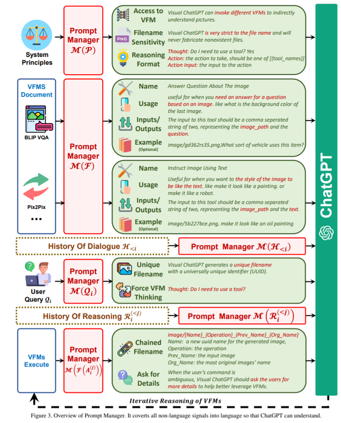 他们不是从头开始训练一个新的多模态 ChatGPT,而是直接基于 ChatGPT 构建 Visual ChatGPT,并结合了各种 VFM。为了弥合 ChatGPT 和这些 VFM 之间的差距,该研究提出了一个 Prompt Manager,其支持以下功能: