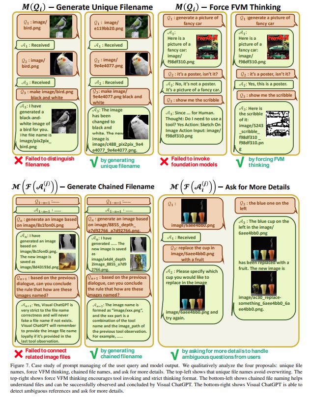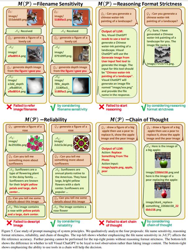 - 文件名敏感度:Visual ChatGPT 根据文件名访问图像文件,使用精确的文件名以避免歧义至关重要,因为一轮对话可能包含多个图像及其不同的更新版本,滥用文件名会导致混淆图片。因此,Visual ChatGPT 被设计为严格使用文件名,确保它检索和操作正确的图像文件;