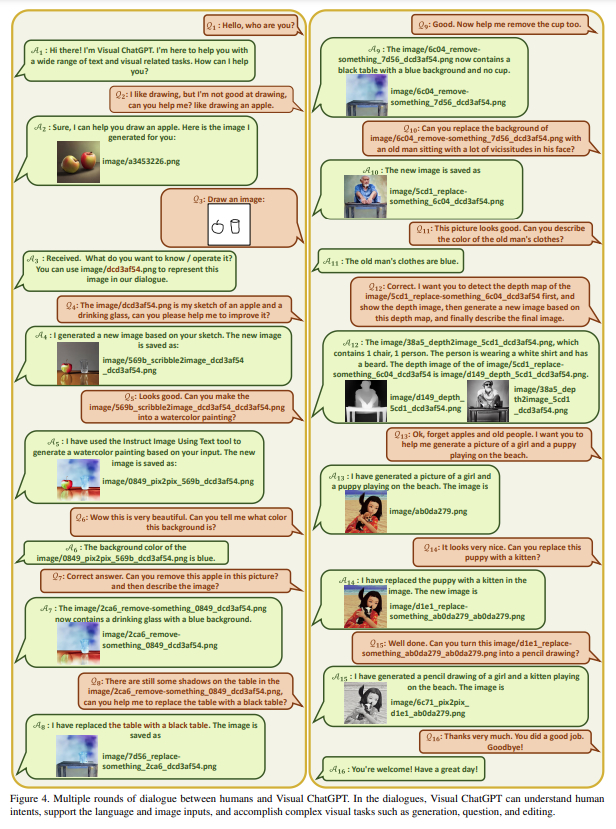 图 4 为 Visual ChatGPT 进行的 16 轮多模态对话案例。在本例中,用户同时询问文本和图像问题,Visual ChatGPT 能够以文本和图像的方式给出响应。