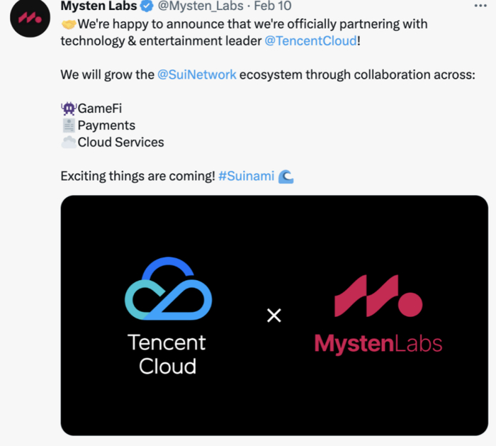 此前在2月10日,Mysten Labs就曾宣布宣布与腾讯云合作,双方将通过合作扩展Sui生态,并在GameFi、支付和云服务领域等方面进行合作。