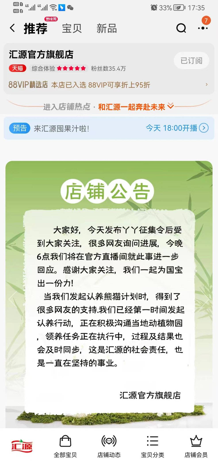 汇源集团淘宝直播间回应认养熊猫:已发起认养行动