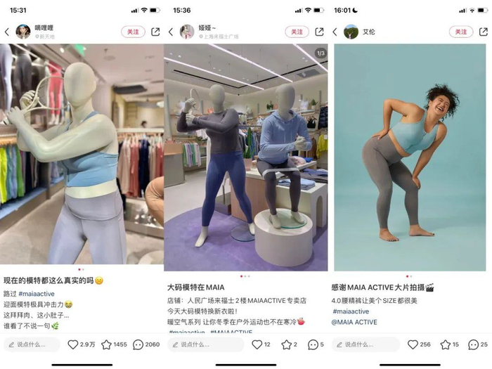 去年夏天,MAIA ACTIVE 通过店内模特让这个人设成功出圈。当时不少顾客发现 MAIA ACTIVE 在门店中放置了大码身材的假人模特,“她”有小肚子,手臂也更粗,更接近现实生活中平凡女性的身材。于是很多用户自发在小红书分享感受,觉得这样的设置真实地呈现了品牌产品穿在“大多数普通人身上的样子”,被包容了。