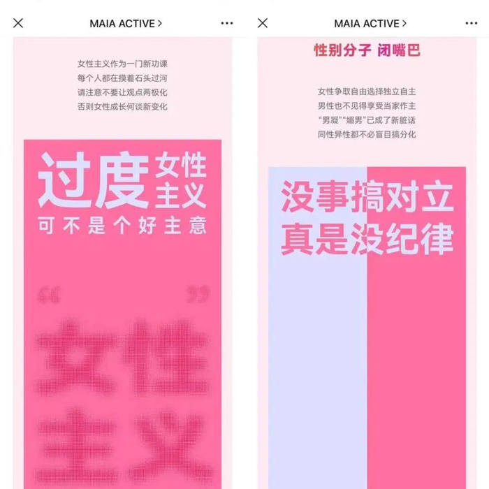 3 月 8 日,MAIA ACTIVE 在官方公众号上推送了一篇标题为《这个 38,闭嘴巴》的文章。现在这篇推文已经被删除,但是从互联网流传的截图来看,里面的一些语句是:“过度女性主义,可不是个好主意”,“没事搞对立,真是没纪律”,“性别分子,闭嘴巴”。